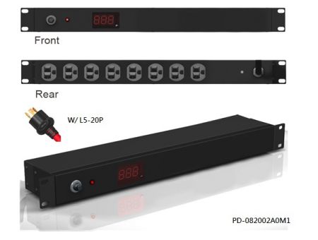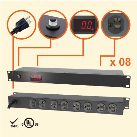8埠帶數位LED電錶插座及時顯示電流量,隨時監測提供安全用電。堅固金屬烤漆外殼、長度19”、高度1U帶有電源指示燈,可讓使用者了解設備目前狀態。機架式電源插座由UL認證工廠設計與製造,此外工廠每年接受UL檢查,讓使用者更加安心。機架式電源排插可以接受客製化設計與生產製造。