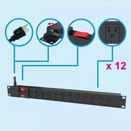 美式12孔機架式電源分配器是給 19 英寸機架機櫃在安裝多個設備供電之排插插座且兩側有一體成型固定支架孔及產品背面的鎖孔安裝槽可增加安裝便利性。外殼選用耐衝擊的塑料製,具備安全防觸電保護門,防雷突波保護功能外並可選配內置的EMI / RFI雜訊濾波器,為了可靈活放置在機房, 機櫃或 電器家具架設備內特別使用180度旋轉電源線夾設計讓設備空間更加乾淨整齊。