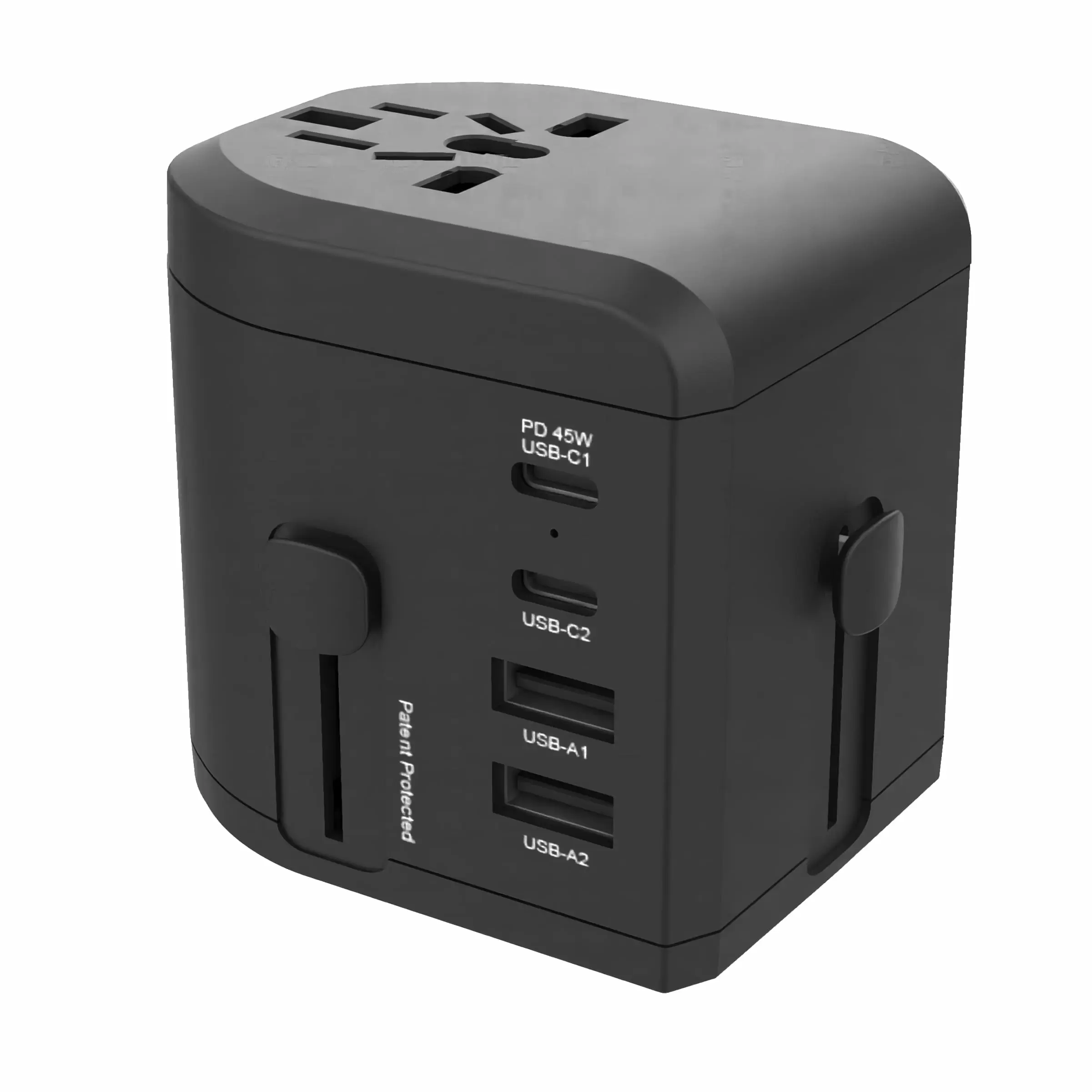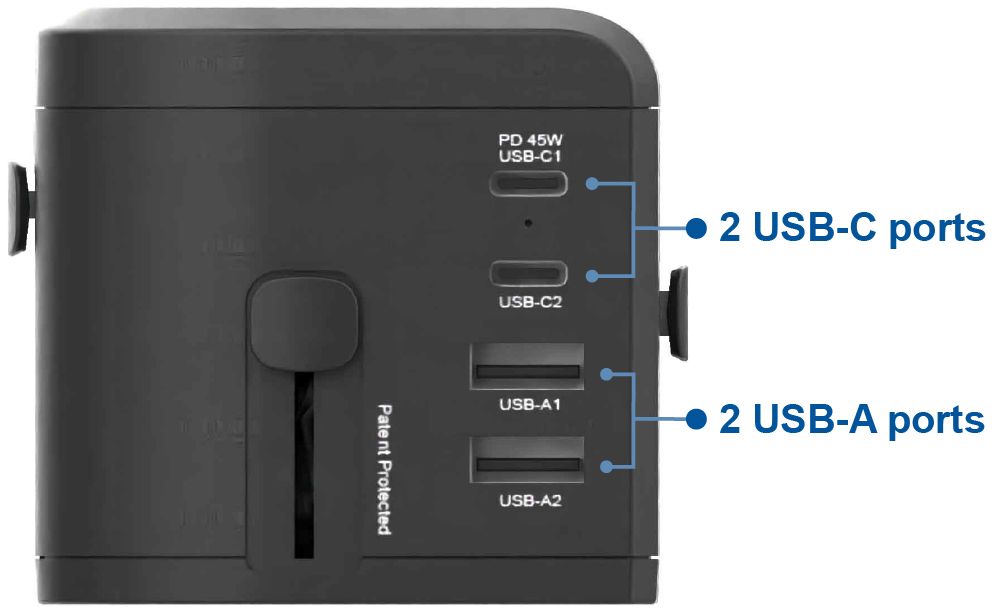 此款45W PD + QC 萬國旅行充電器具有專利保護的特殊滑動機構,內建4種規格插腳(美規/歐規/英規/澳規),一次只能推出1種規格插腳使用,為您提供一個簡單而安全的充電方式,將您的可擕式電器連接到195多個國家的電源插座,無論走到哪裡不必再攜帶單獨的充電器或有多個適配器,更不用擔心充電座不夠使用的問題。產品具備CE、FCC、RoHS等認證。搭載過電壓、過電流、短路等多重保護系統, 並同時配置過載保險絲。
